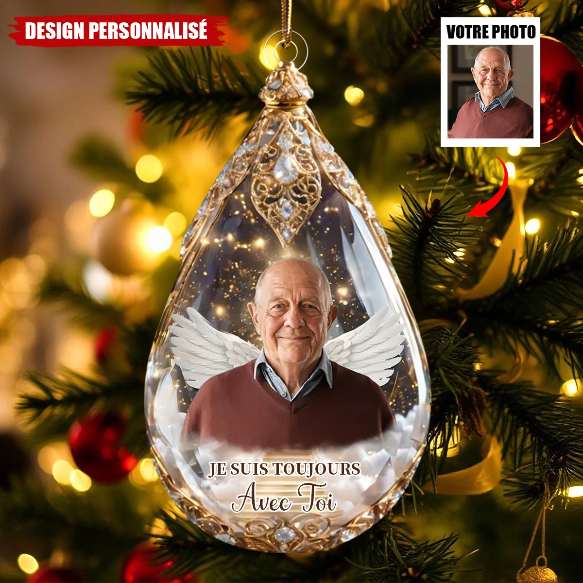 Honorez la mémoire d’un être cher avec cet ornement, délicatement conçu en forme de goutte d’ange. Votre photo est intégrée dans un design lumineux, entourée d’ailes d’ange et de détails dorés élégants, pour un hommage aussi tendre qu’étincelant.