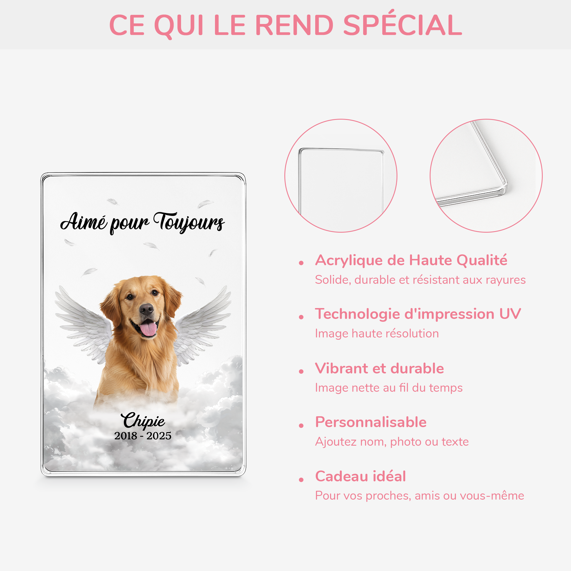 Offrez un hommage éternel à votre compagnon fidèle avec notre Bloc Commémoratif Personnalisé pour Animaux. Conçu avec soin et élégance, ce bloc en acrylique transparent met en valeur une photo personnalisée de votre animal avec une inscription "Aimé pour Toujours", ainsi que les dates de vie pour garder précieusement sa mémoire.