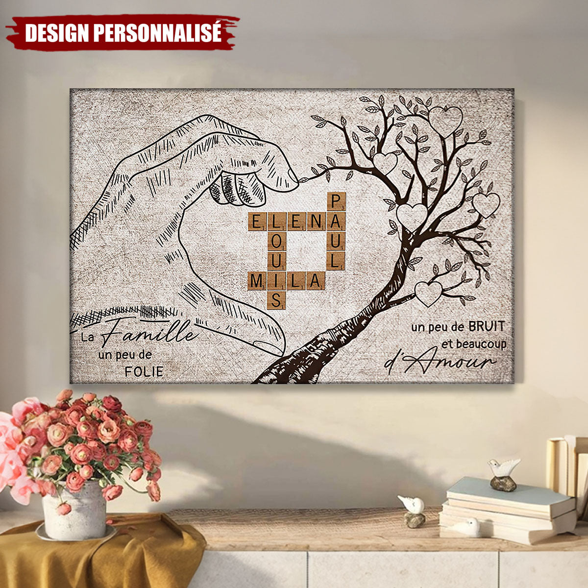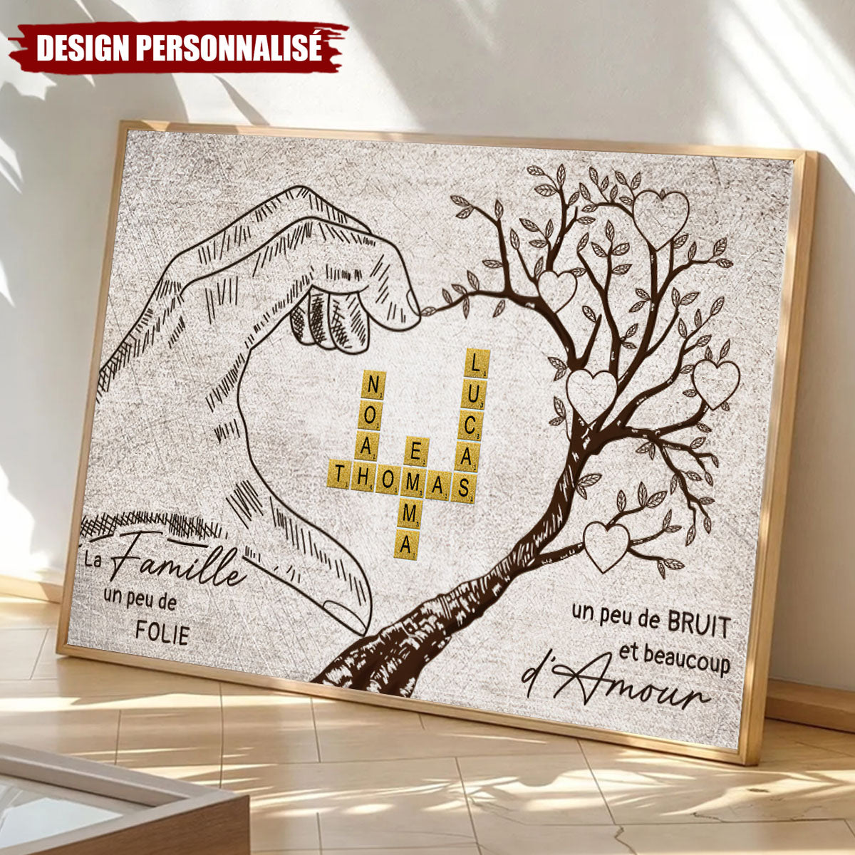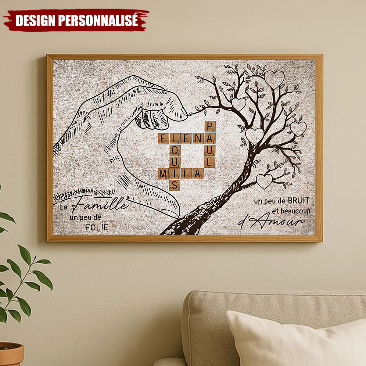 Ce poster personnalisé met en valeur vos prénoms sous forme de pièces de Scrabble, intégrés dans un magnifique dessin représentant des mains formant un cœur et un arbre de vie symbolisant l’amour et les liens familiaux.