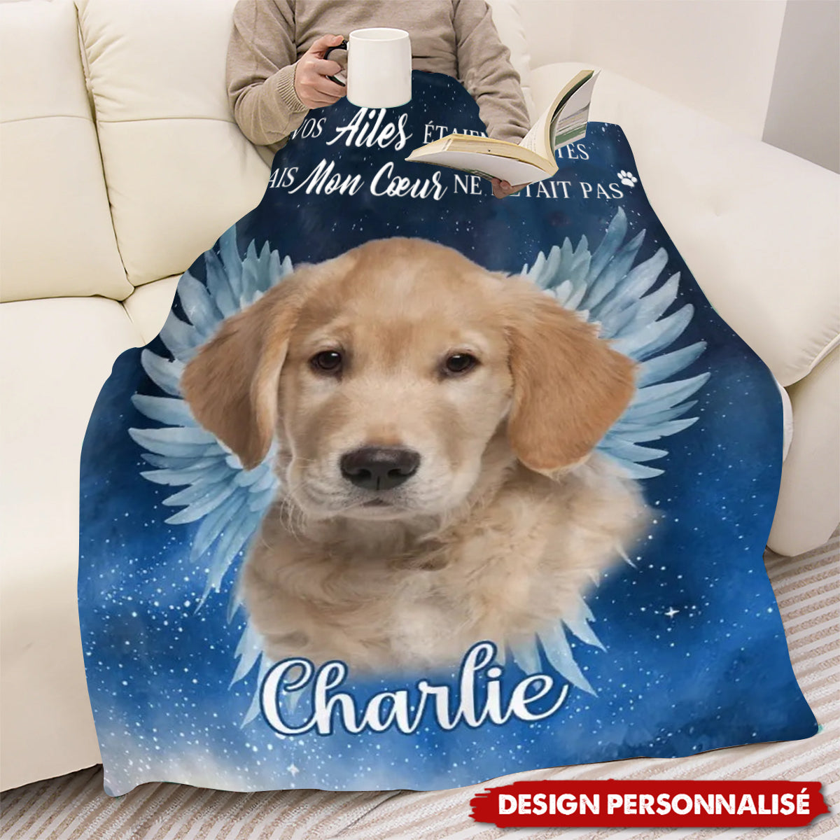 Cette couverture douce et réconfortante met en valeur la photo de votre animal entouré d’ailes d’ange,c’est une source de chaleur et de réconfort pour tous ceux qui ont perdu un animal bien-aimé. Elle vous enveloppe de douceur tout en gardant la mémoire de votre compagnon toujours près de vous.