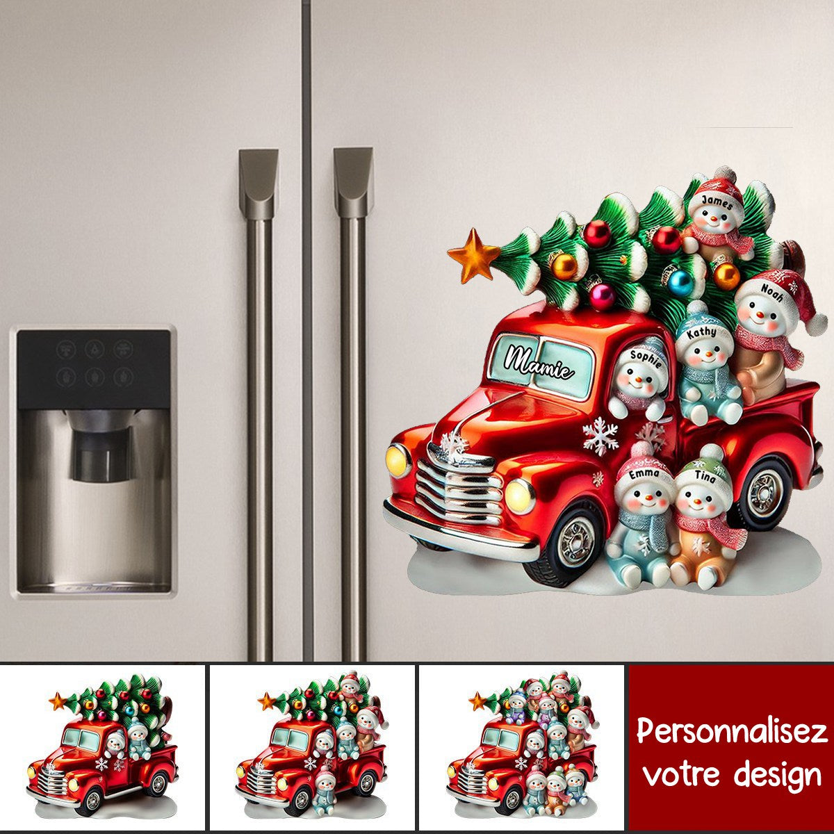 Apportez la magie de Noël dans votre maison avec ce magnifique aimant de réfrigérateur personnalisé en forme de camion rouge vintage transportant un sapin décoré 🎄✨. Autour du camion, de joyeux bonhommes de neige portent fièrement les prénoms de vos proches, pour un souvenir unique et chaleureux.