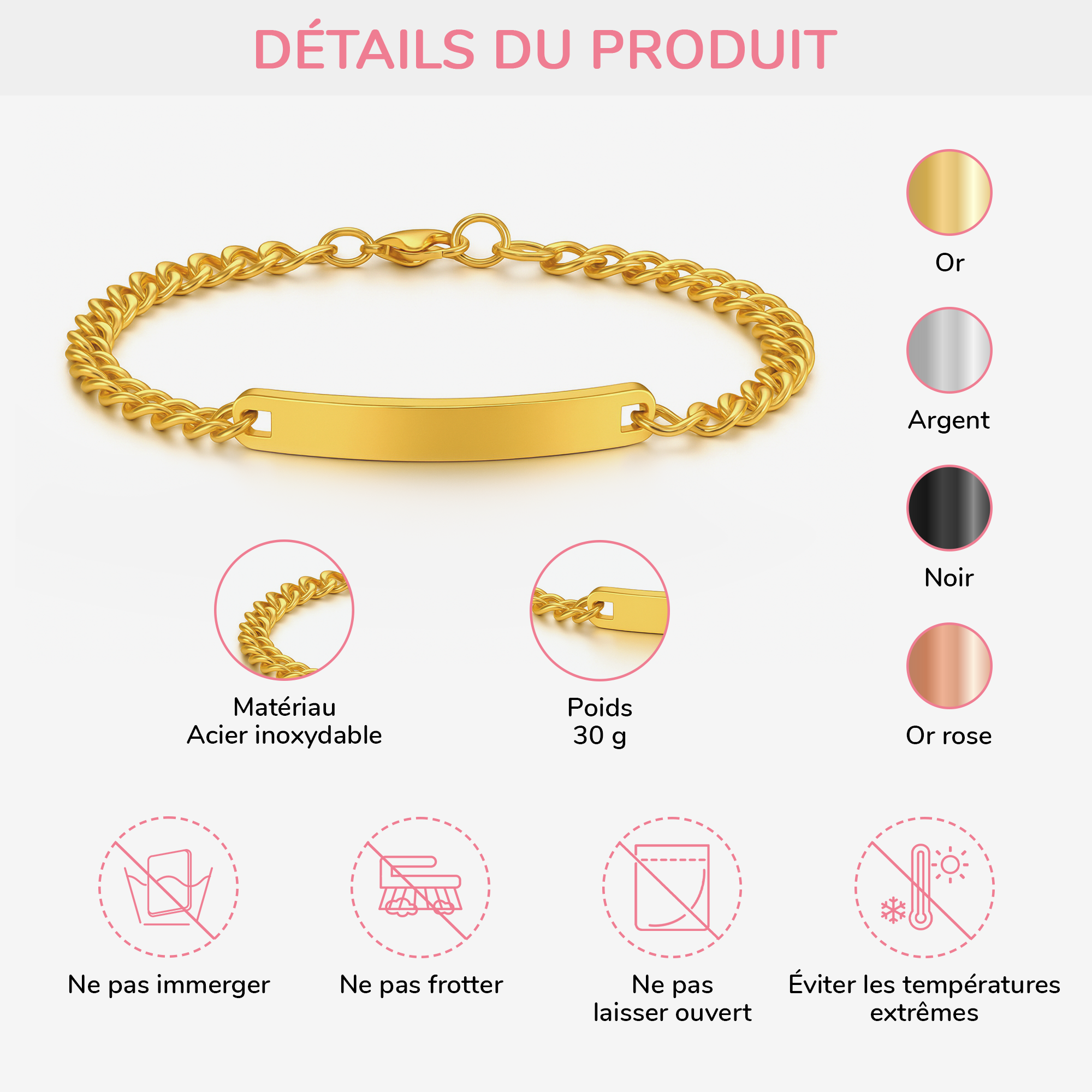 Offrez un bijou unique qui allie style raffiné et touche personnelle grâce à ce bracelet personnalisé avec nom gravé. Parfait pour exprimer vos sentiments ou offrir un cadeau inoubliable, ce bracelet est disponible en plusieurs finitions élégantes pour s’adapter à toutes les occasions.
