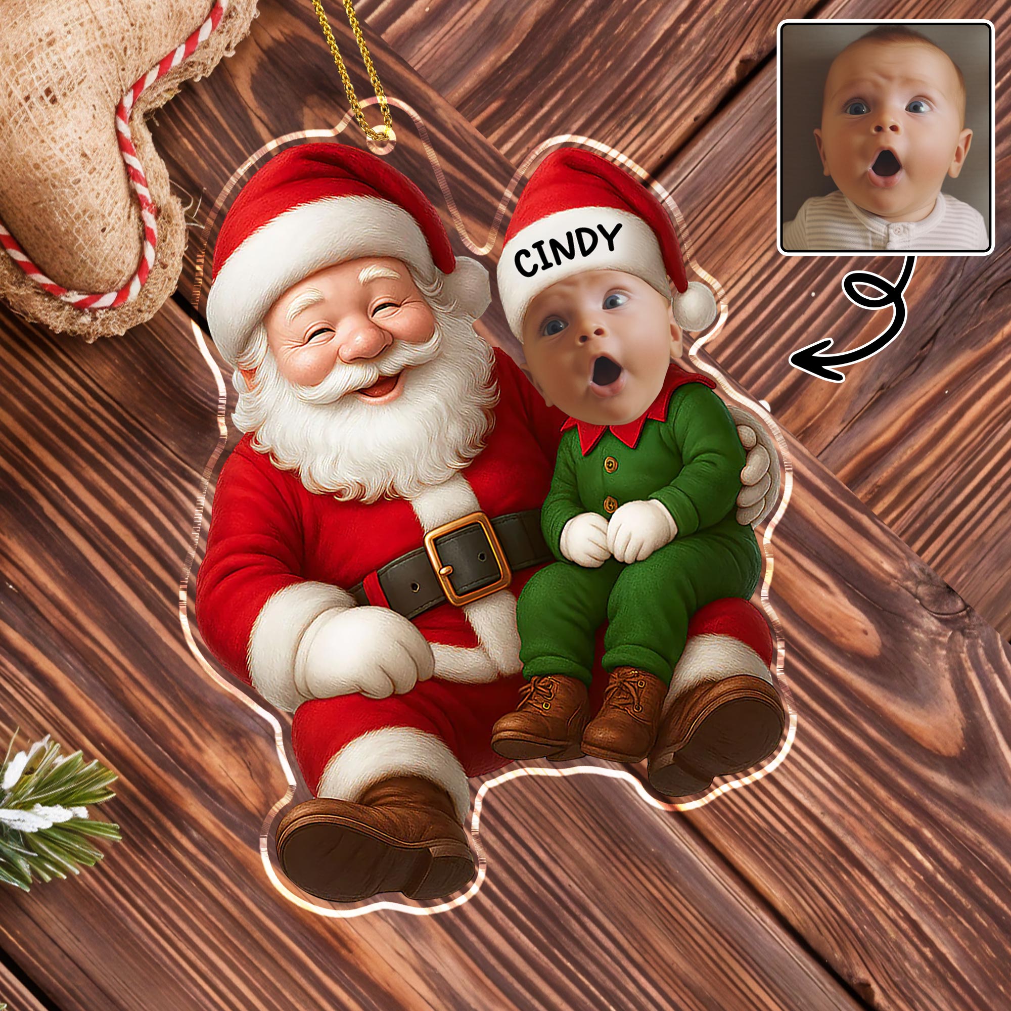 Créez une décoration de Noël unique avec notre ornement acrylique personnalisé Père Noël & Bébé. Transformez la photo de votre enfant en une illustration adorable où il est assis avec le Père Noël, apportant ainsi une touche magique et festive à votre sapin.