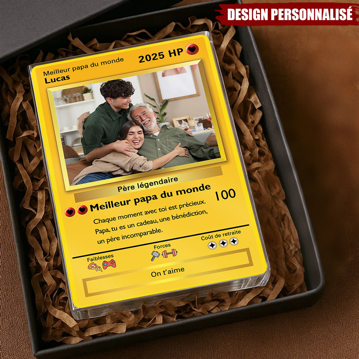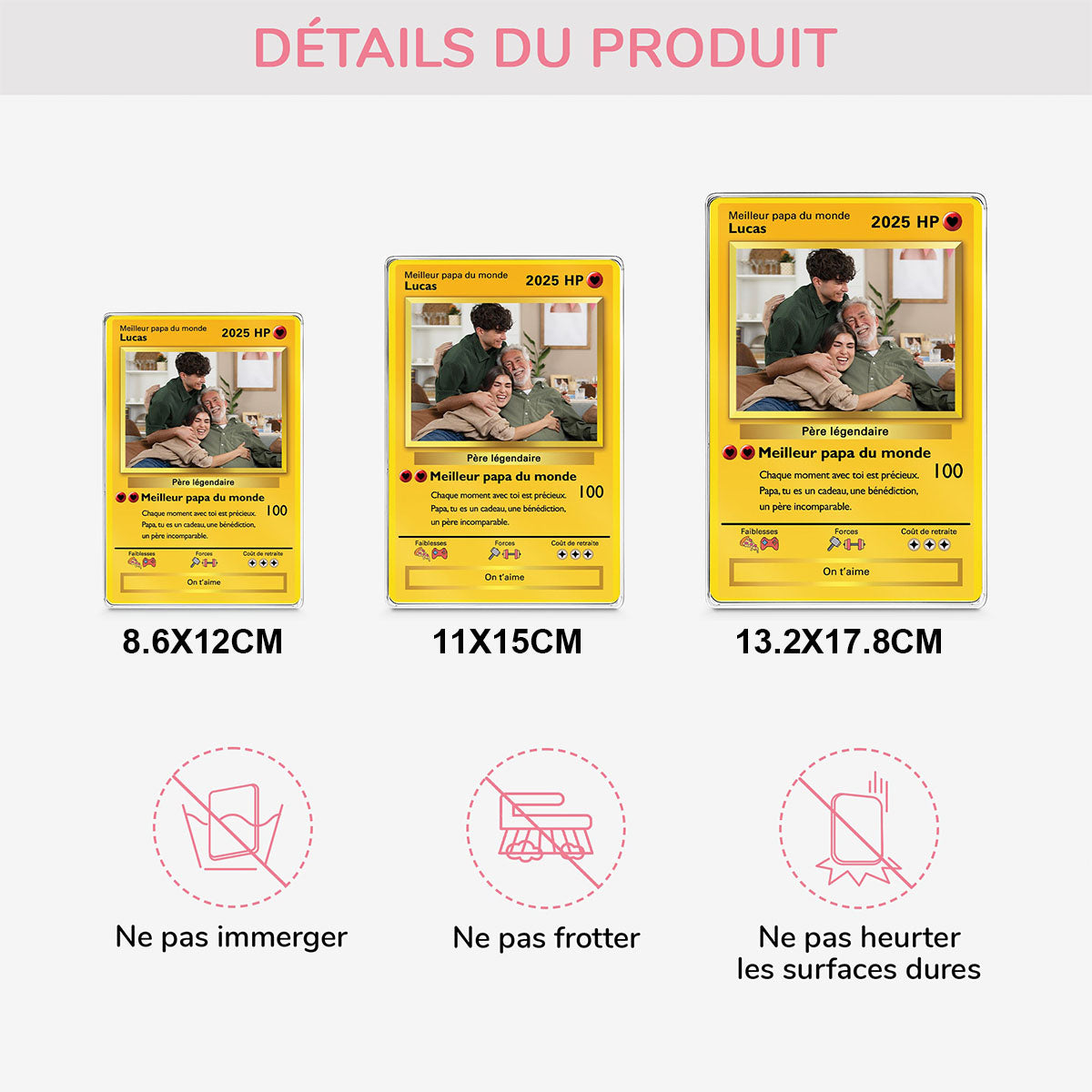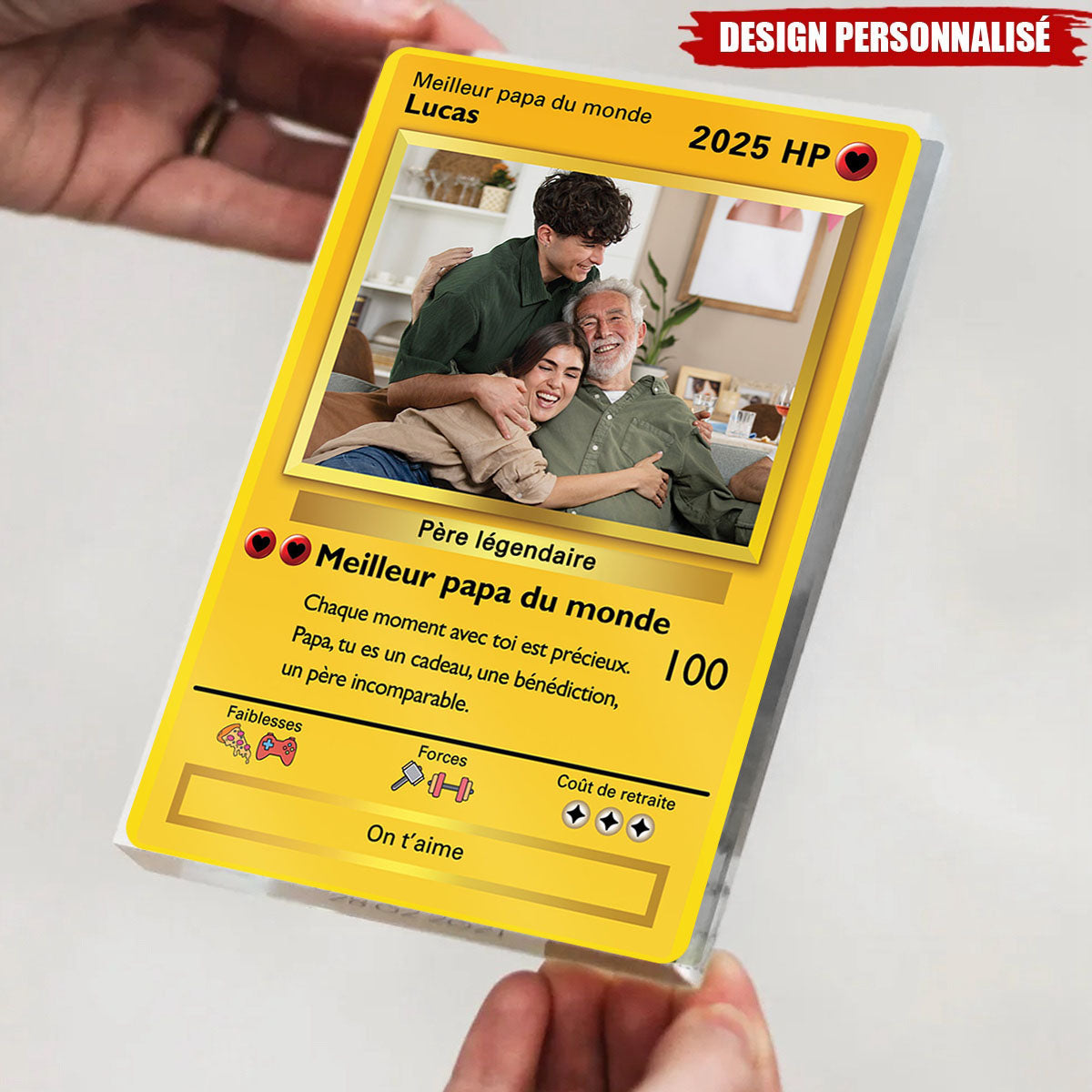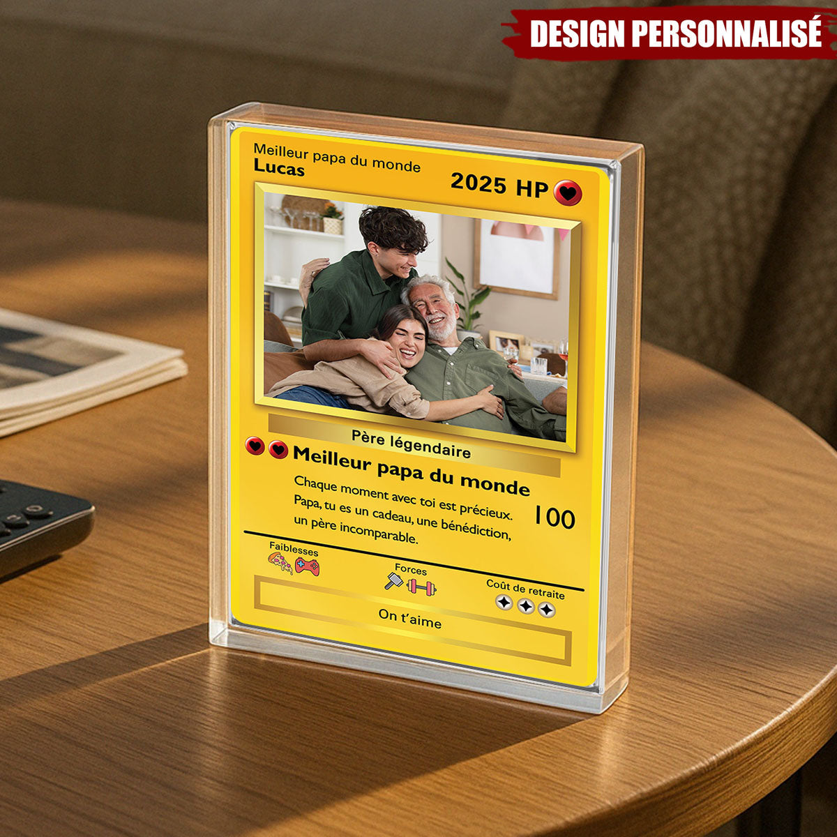 Offrez à votre papa une surprise pleine de créativité et de tendresse avec notre plaque acrylique personnalisée style carte de jeu. Fabriquée en acrylique de haute qualité, cette plaque durable et élégante transforme vos moments précieux en un souvenir amusant et inoubliable.
