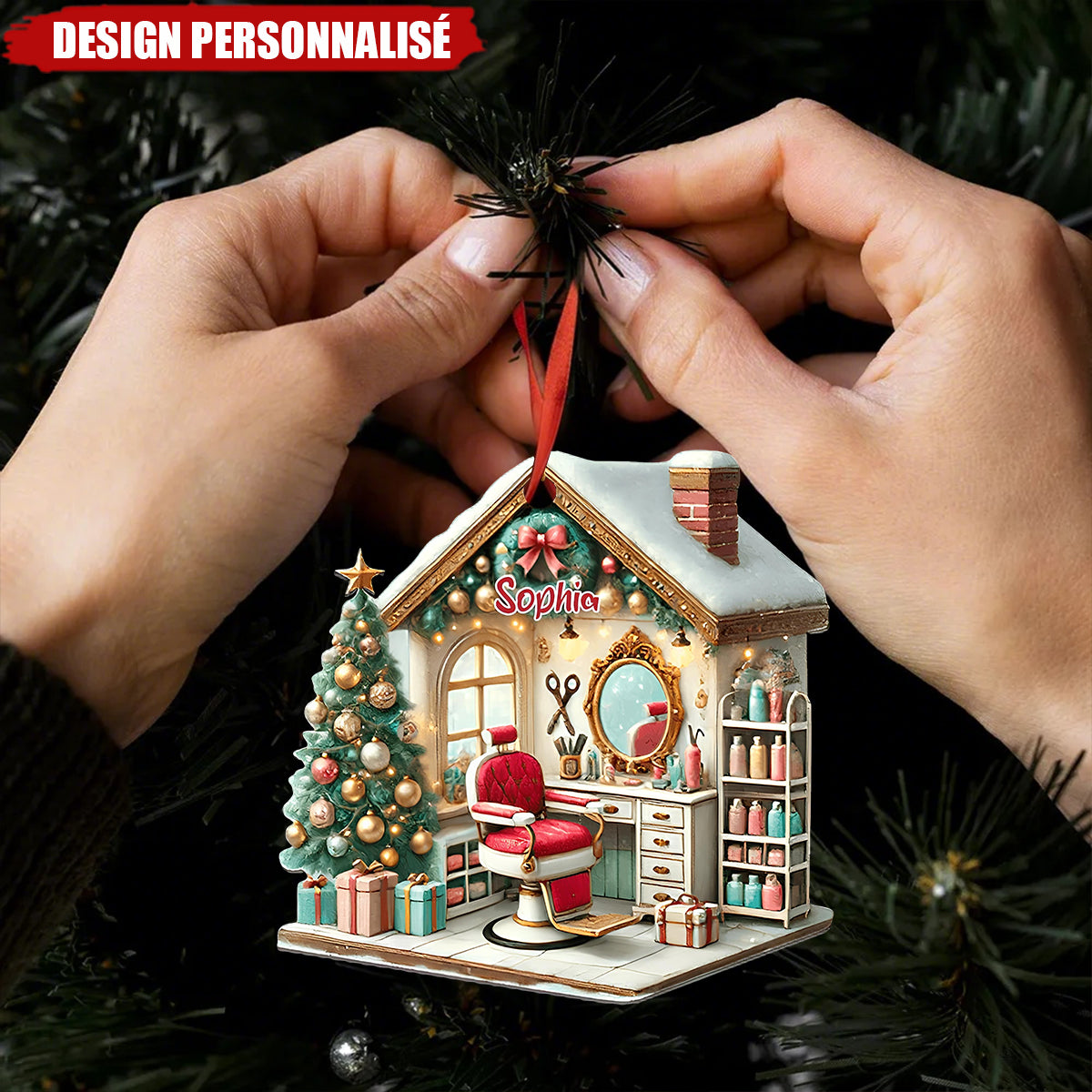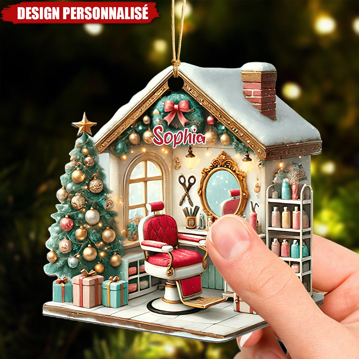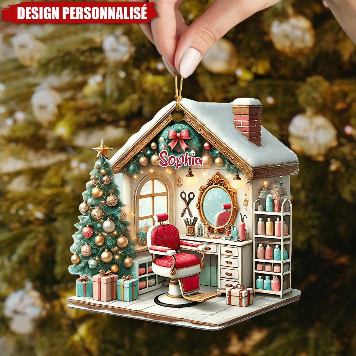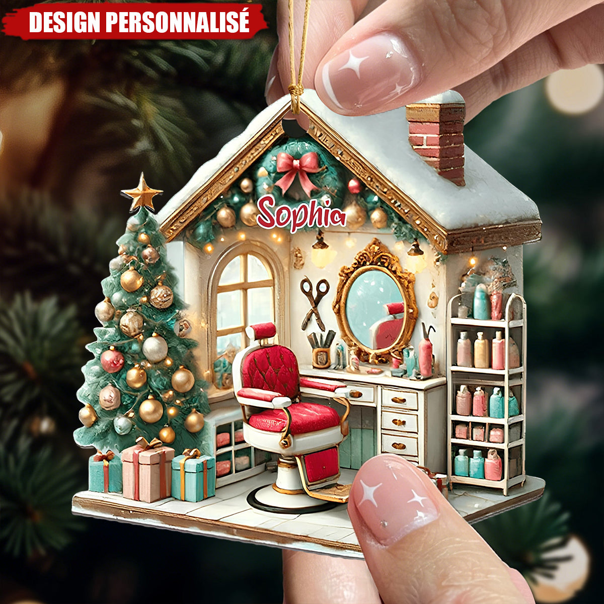 Créez une ambiance festive unique avec notre décoration de Noël personnalisée en forme de maison de coiffure. Ornée d’un sapin lumineux, d’un fauteuil vintage et de détails charmants, cette pièce est parfaite pour les coiffeurs, les esthéticiennes ou toute personne aimant le style élégant des salons de beauté.
