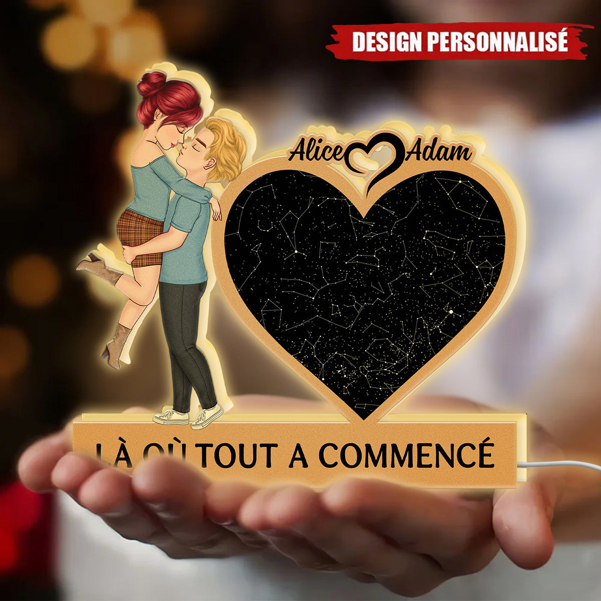 Offrez un cadeau qui fera battre le cœur : cette boîte lumineuse en acrylique personnalisée est l’expression parfaite de l’amour éternel. Avec son design en cœur constellé, elle symbolise l’instant magique “Là où tout a commencé”.
