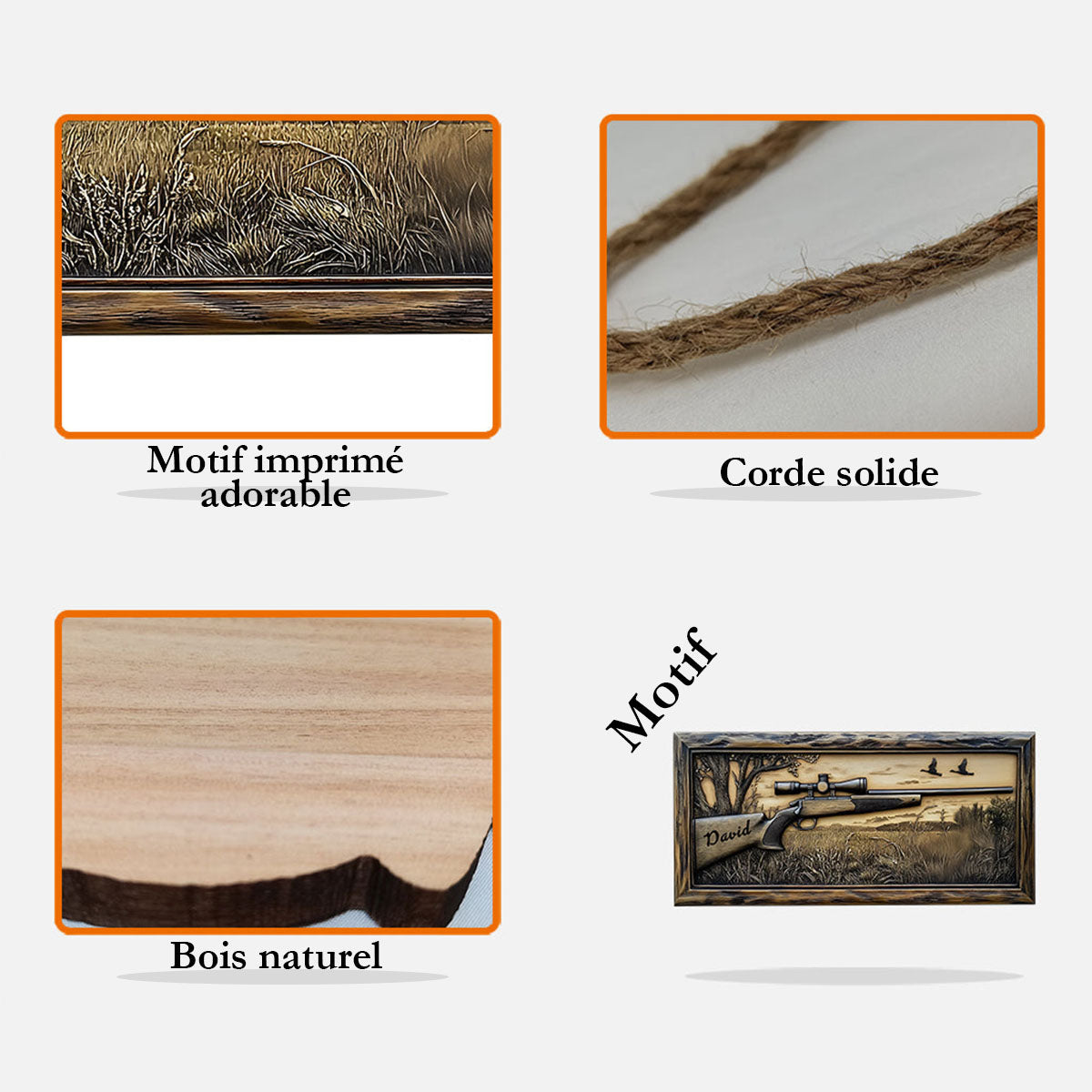 Chaque pièce est finement sculptée et met en valeur un fusil de chasse gravé avec le prénom de votre choix, accompagné de détails naturels comme des arbres, cerfs ou oiseaux en plein vol.