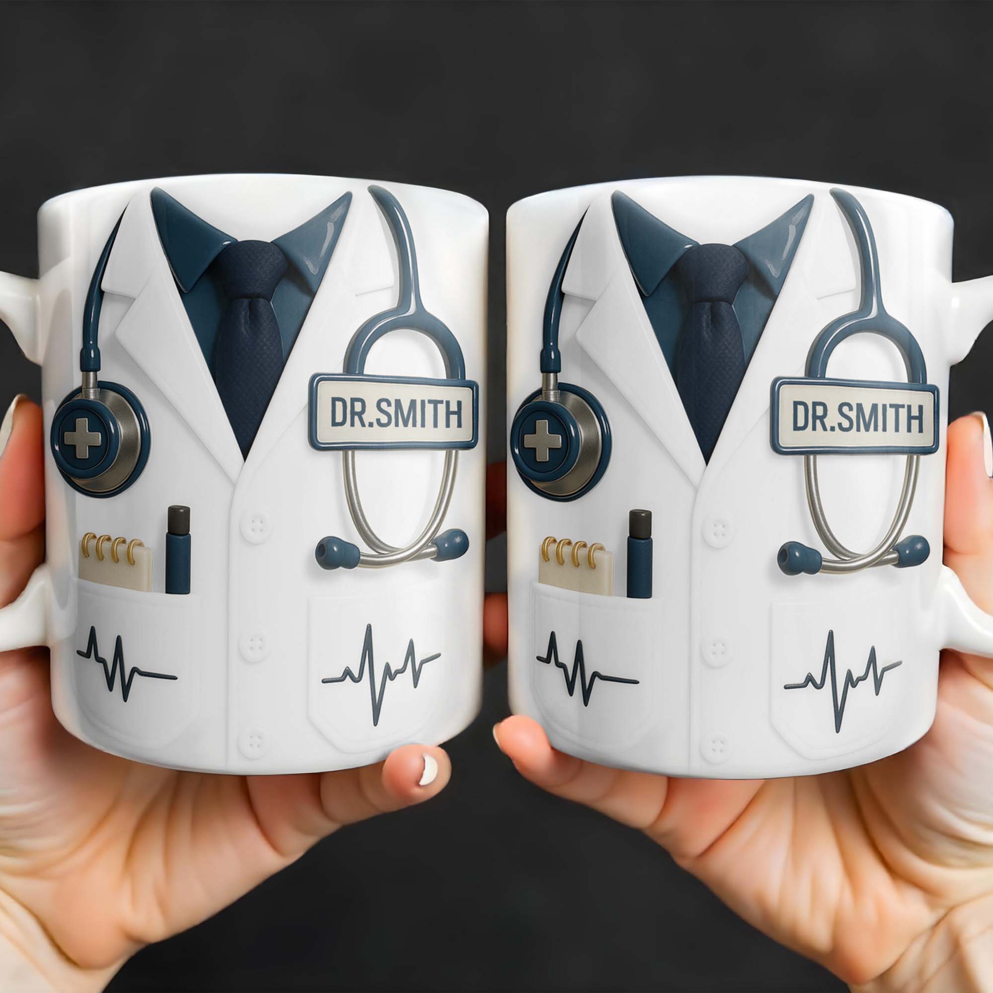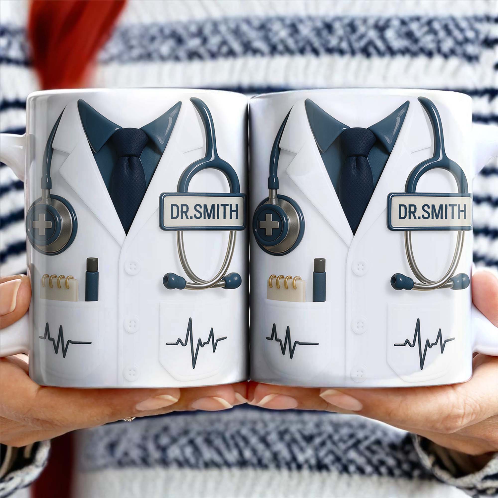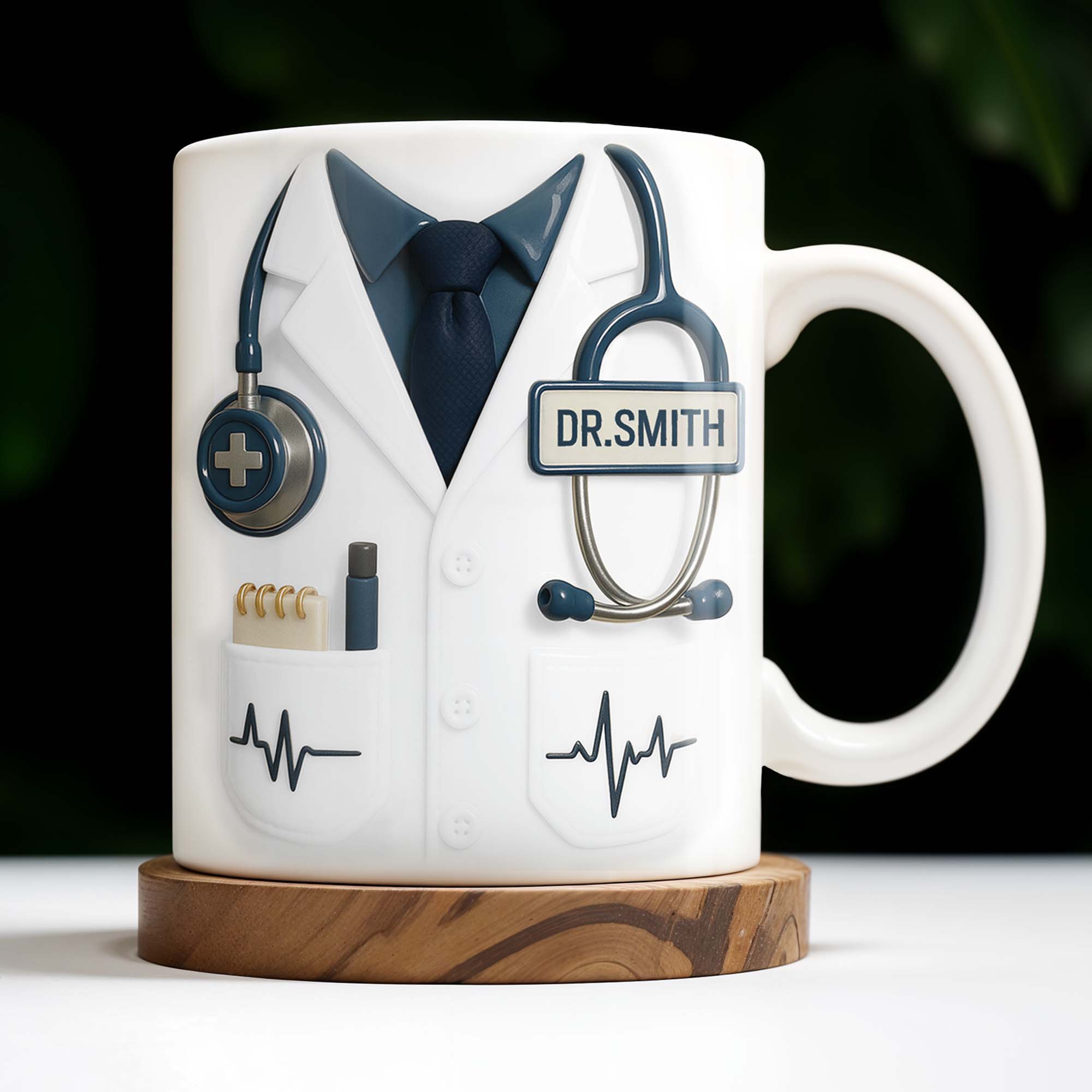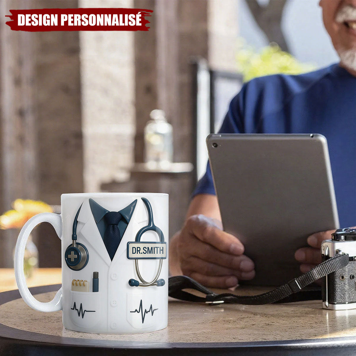 Offrez un cadeau exceptionnel avec ce mug personnalisé pour médecin, conçu spécialement pour les docteurs et professionnels de santé. Fabriqué en céramique de haute qualité, il présente un design original en forme de blouse médicale avec stéthoscope et badge nominatif.