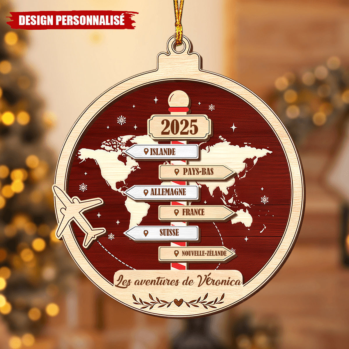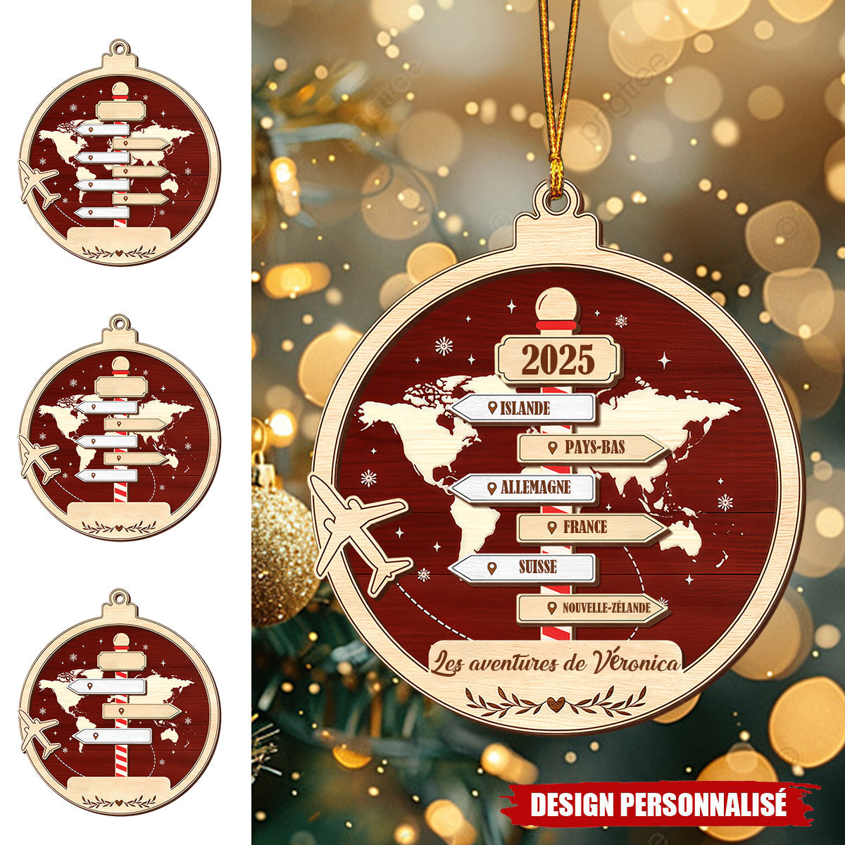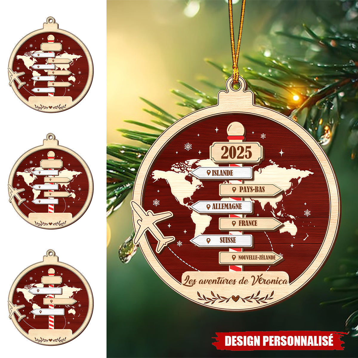 Cet ornement en forme de panneau directionnel est parfait pour représenter vos destinations préférées à travers le monde. Que ce soit pour revivre vos aventures de 2025 ou offrir un cadeau significatif à un globe-trotteur, cet accessoire saura toucher en plein cœur.