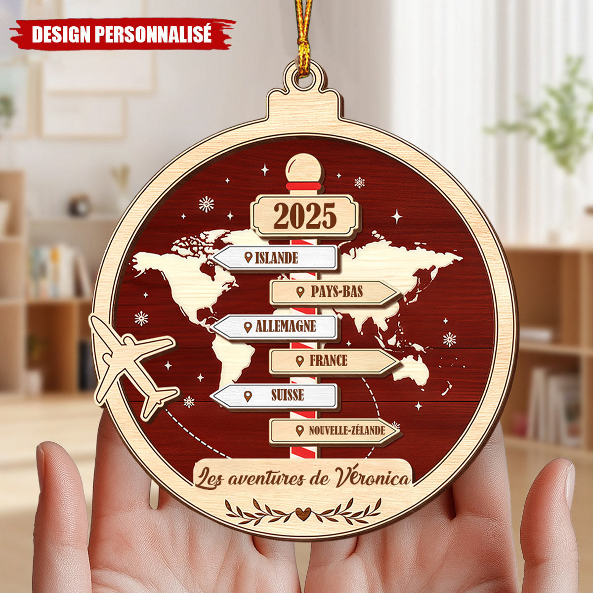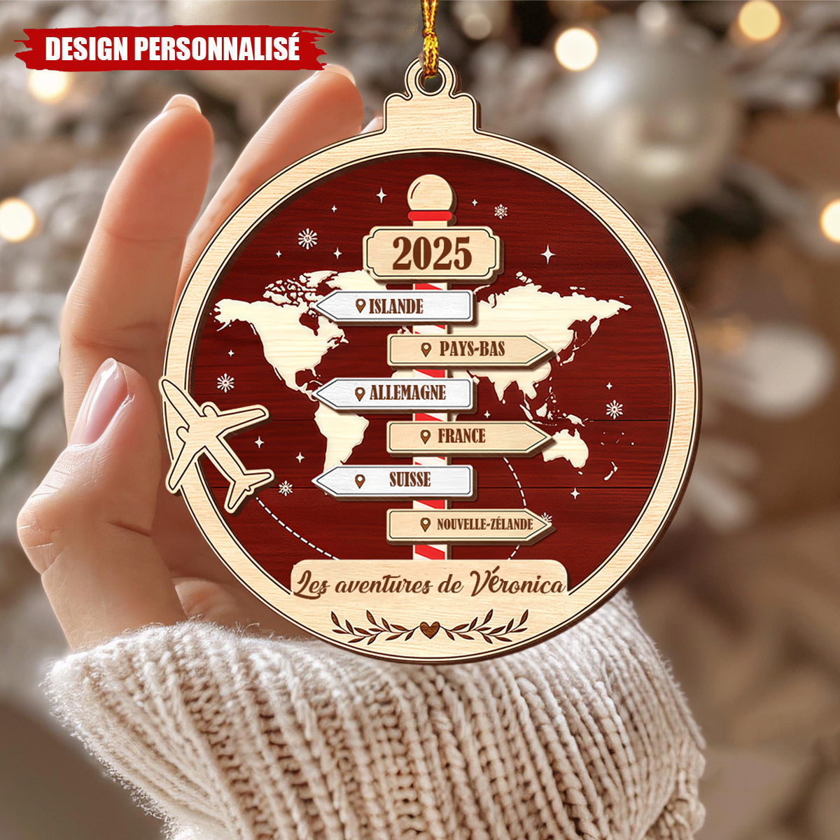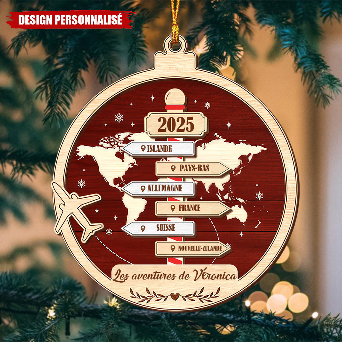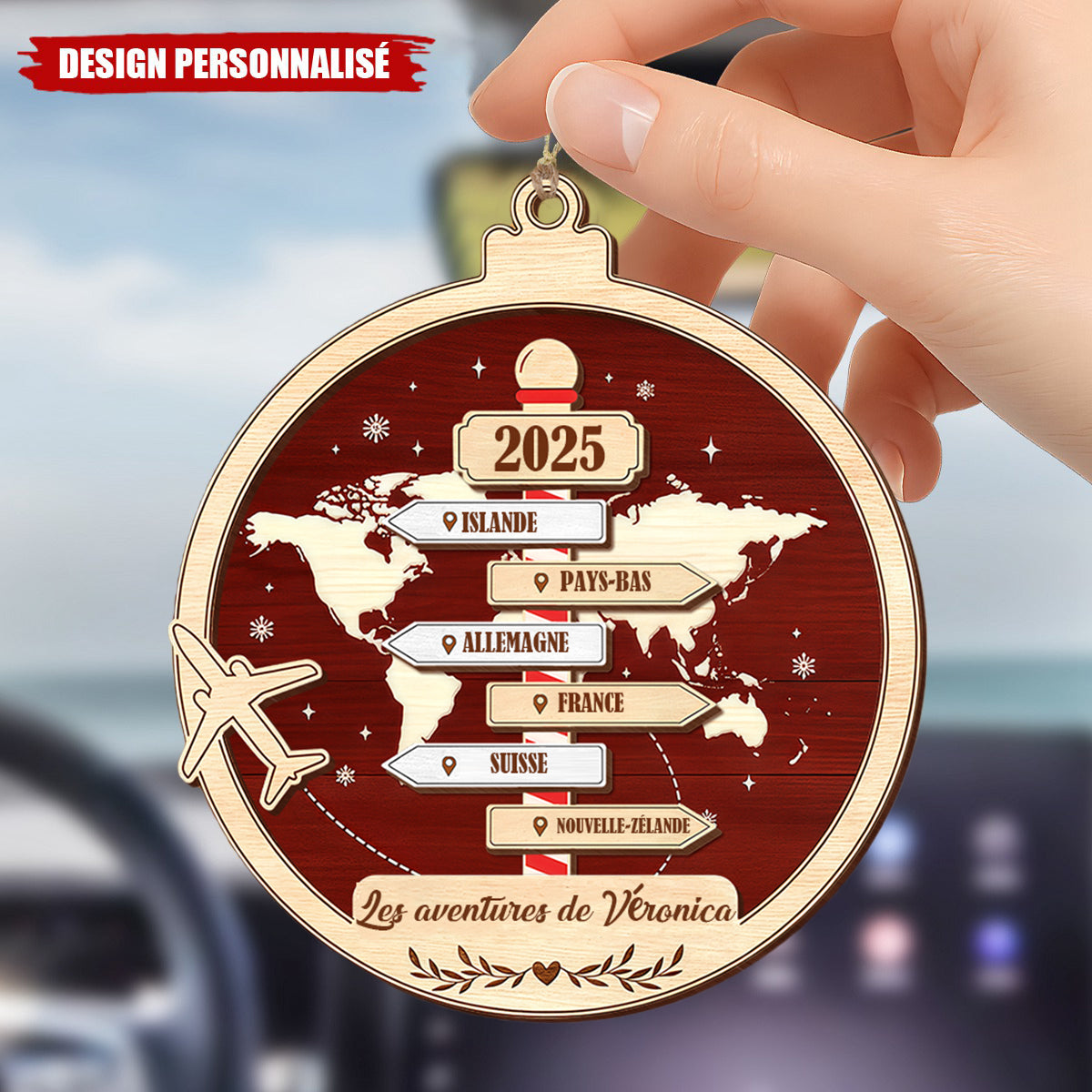 Cet ornement en forme de panneau directionnel est parfait pour représenter vos destinations préférées à travers le monde. Que ce soit pour revivre vos aventures de 2025 ou offrir un cadeau significatif à un globe-trotteur, cet accessoire saura toucher en plein cœur.