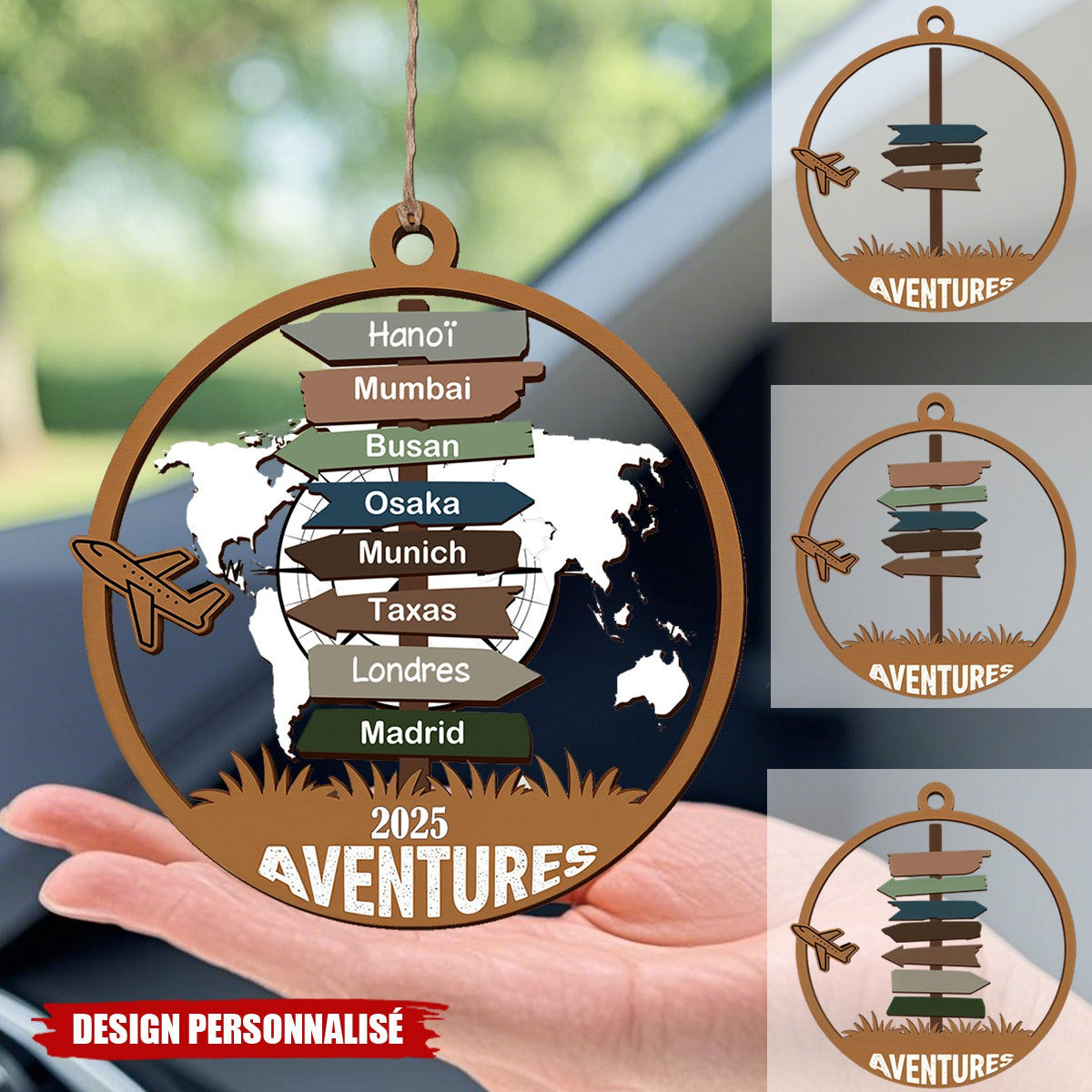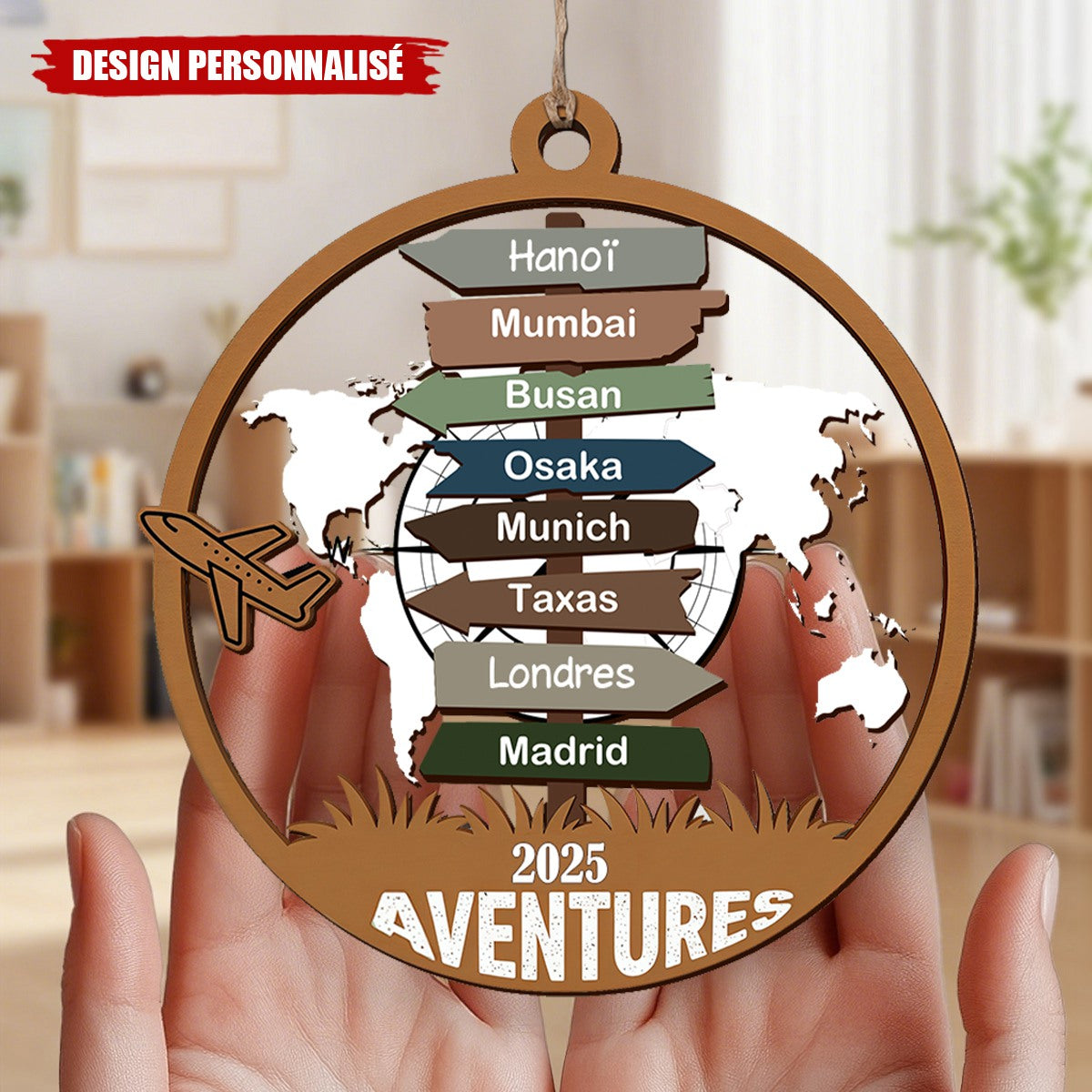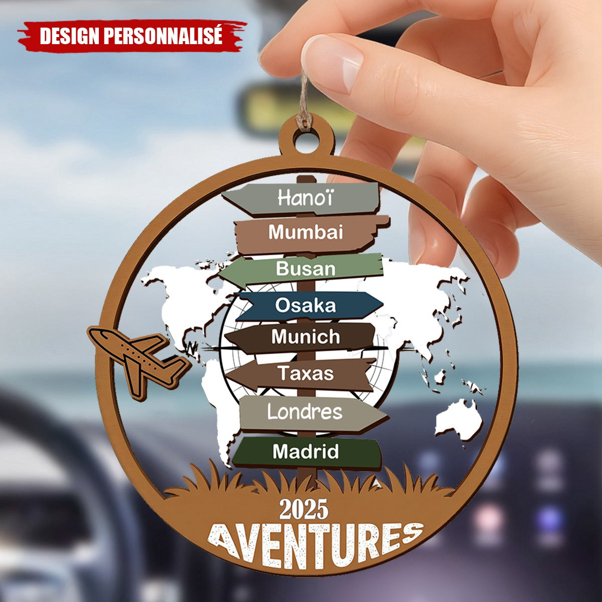 Ce charmant ornement en forme de panneau directionnel met en valeur vos destinations préférées autour du monde – avec une touche personnalisée. Accrochez-le dans votre voiture, sur le sapin de Noël ou même à la maison pour revivre vos aventures de 2025 !