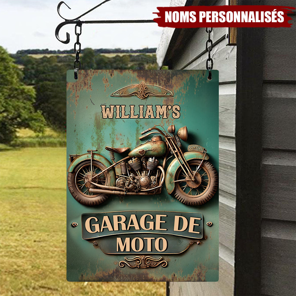 Plaque Garage Moto Personnalisée – Style Vintage avec Nom et Moto Rétro