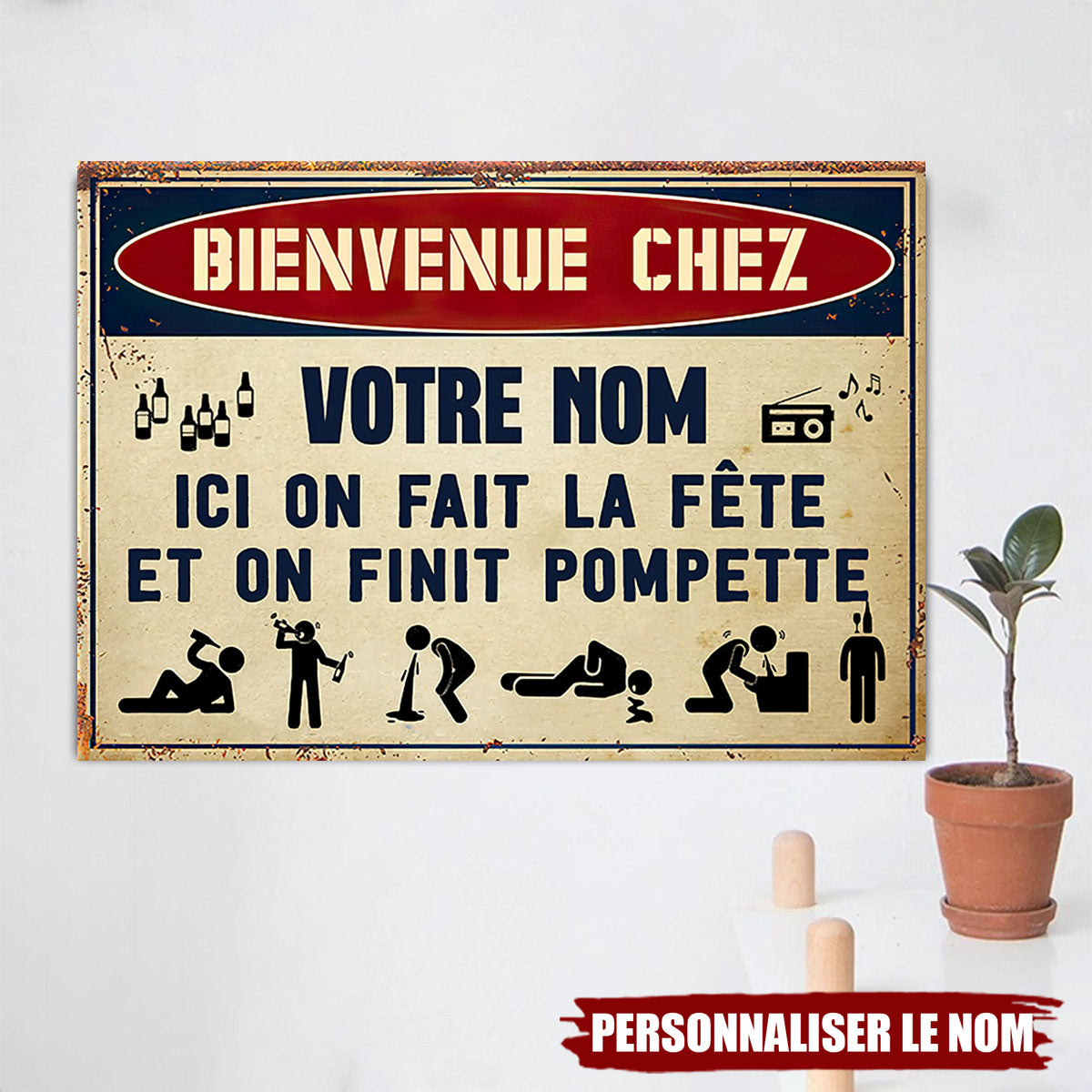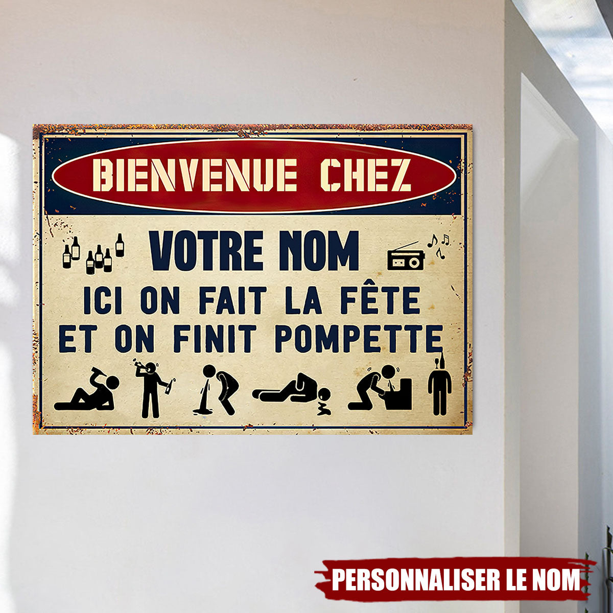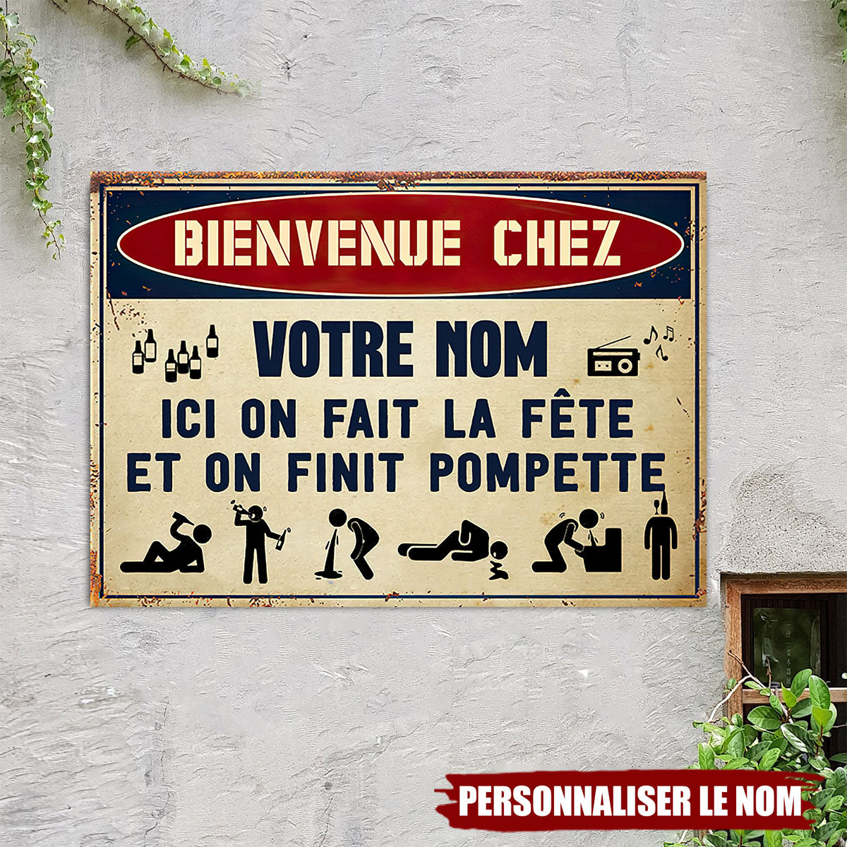 Ajoutez une touche d’humour à votre espace festif avec cette plaque métallique personnalisée ! Inscrite "Bienvenue chez [Votre nom] – Ici on fait la fête et on finit pompette", cette enseigne est parfaite pour les amateurs de soirées mémorables. Que ce soit dans votre bar maison, votre jardin ou votre garage, elle fera sourire vos invités dès leur arrivée.
