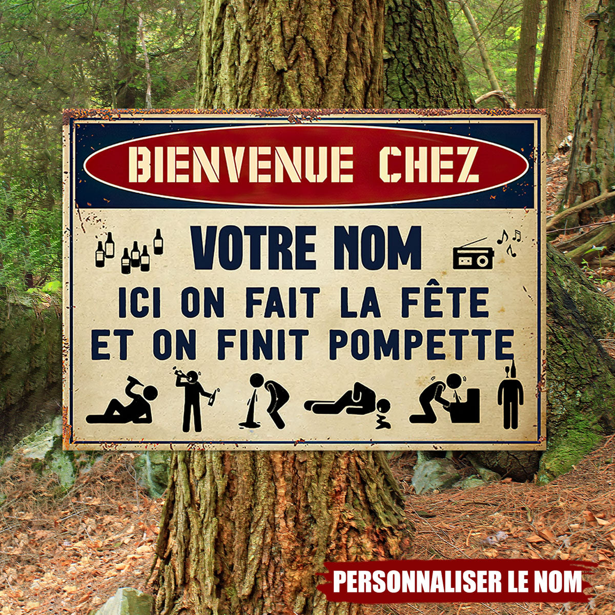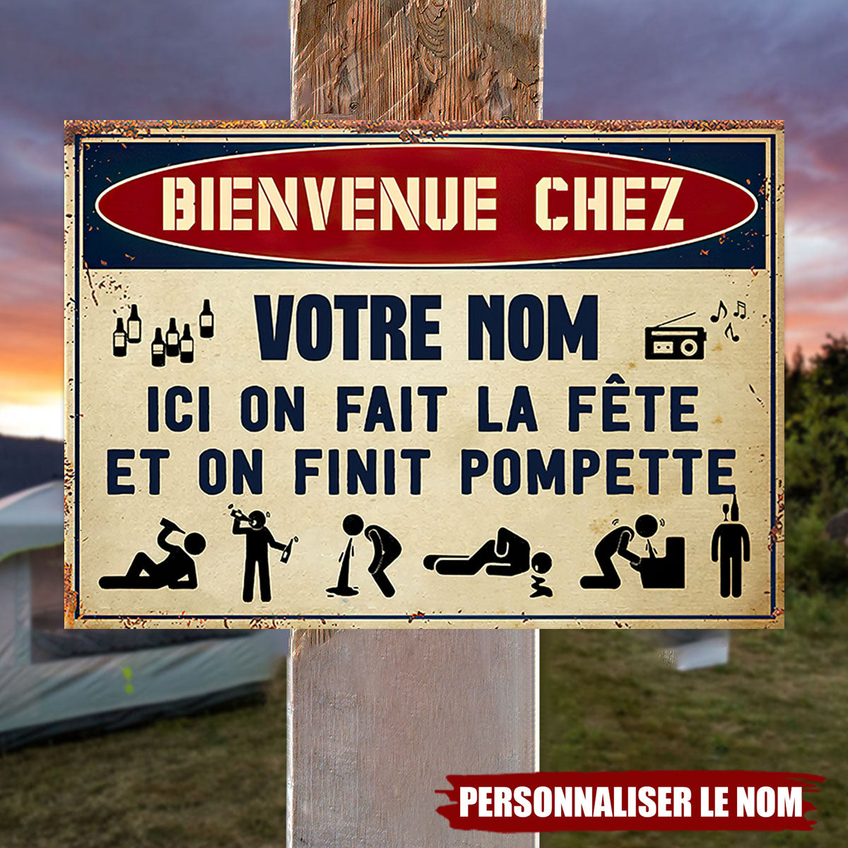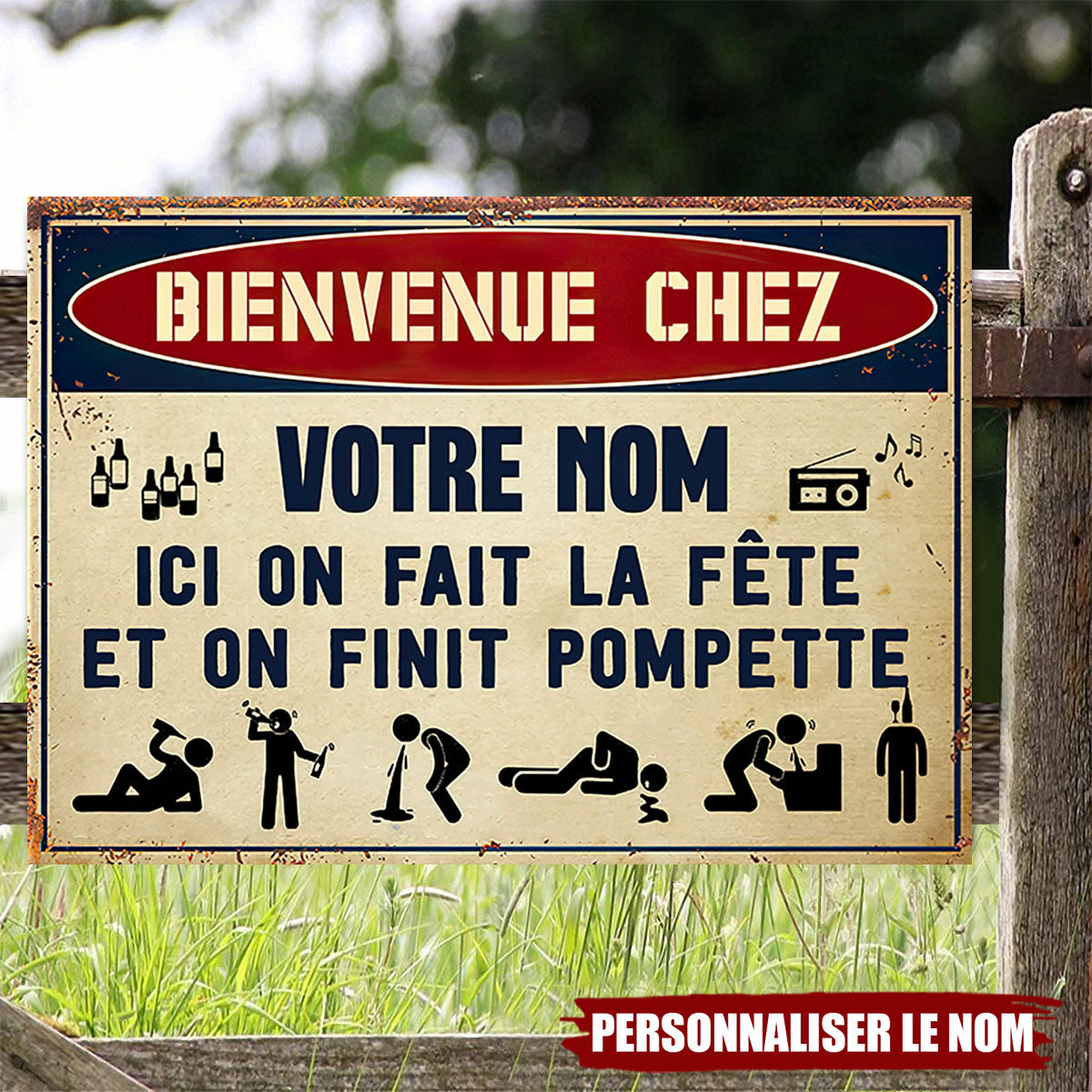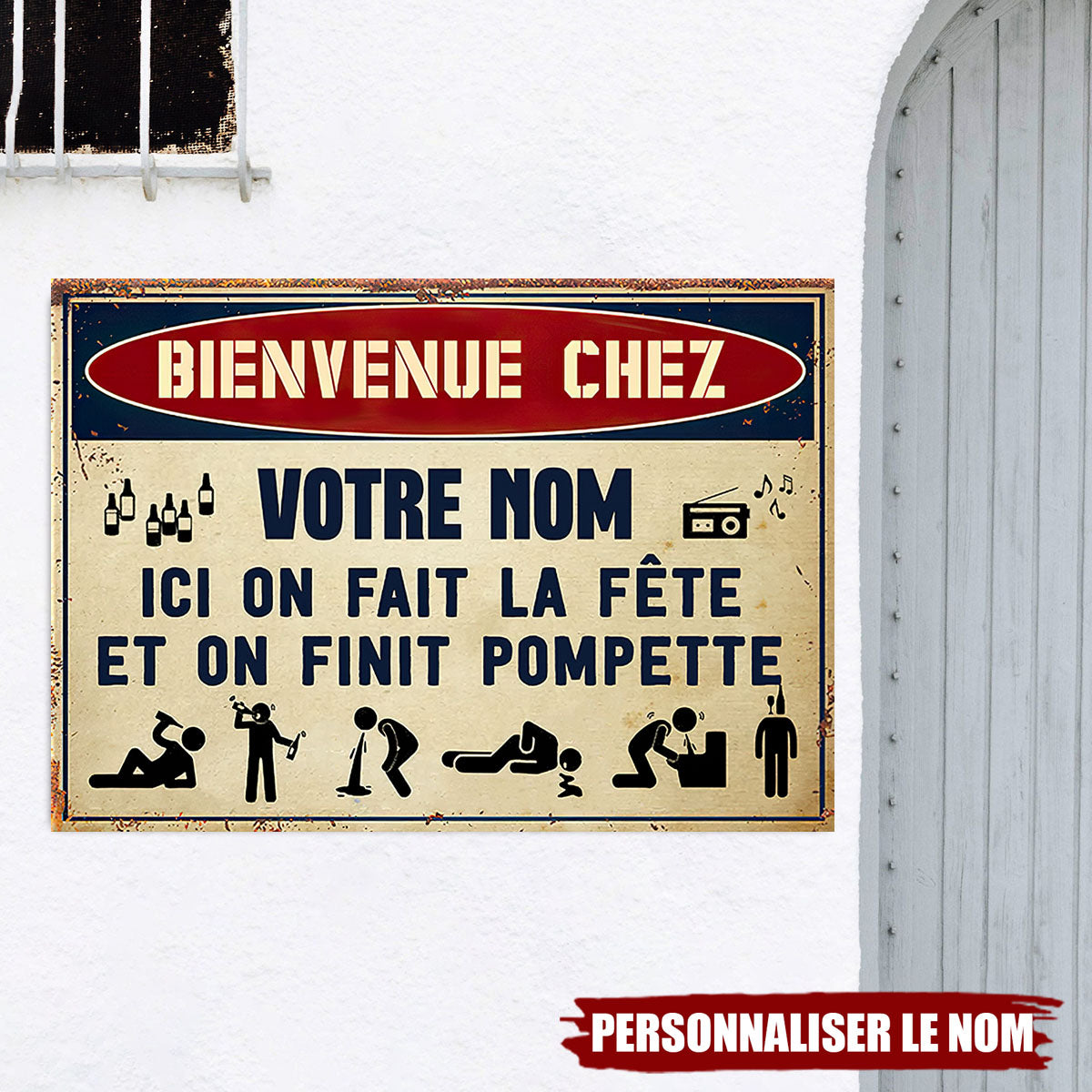 Ajoutez une touche d’humour à votre espace festif avec cette plaque métallique personnalisée ! Inscrite "Bienvenue chez [Votre nom] – Ici on fait la fête et on finit pompette", cette enseigne est parfaite pour les amateurs de soirées mémorables. Que ce soit dans votre bar maison, votre jardin ou votre garage, elle fera sourire vos invités dès leur arrivée.