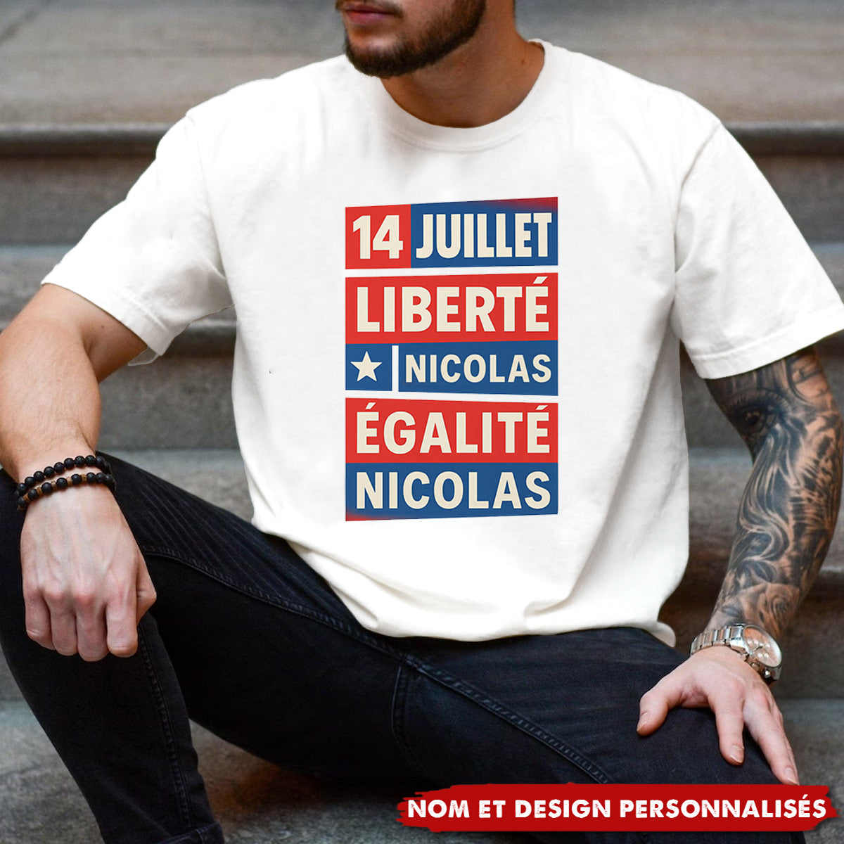 Célébrez la Fête Nationale avec style grâce à ce t-shirt unique arborant fièrement "14 Juillet", "Liberté" et "Égalité" accompagnés de votre prénom personnalisé. Conçu dans des tons patriotiques rouge, blanc et bleu, ce t-shirt est parfait pour les rassemblements, les feux d'artifice ou en souvenir de cette journée emblématique. Offrez-le ou portez-le fièrement pour montrer votre attachement à la France !